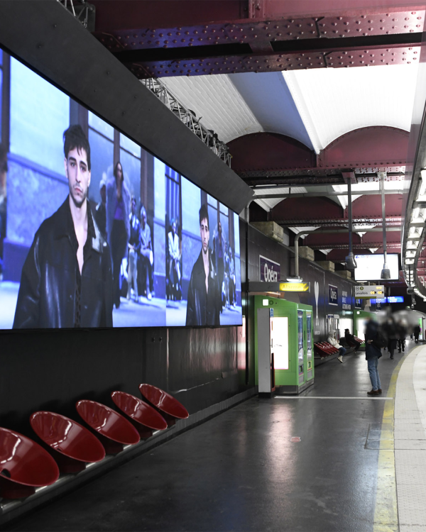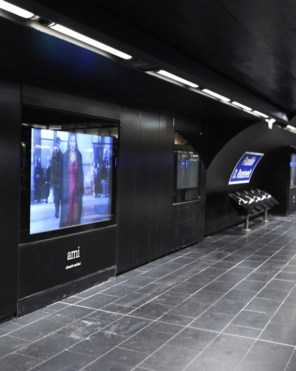 A full domination of Paris' iconic metro stations to unveil the new AMI Paris collection. The Opéra, Concorde, and Franklin Roosevelt stations were entirely adorned in the campaign's colors, with a record number of screens broadcasting the AMI runway show the day after the live event.
